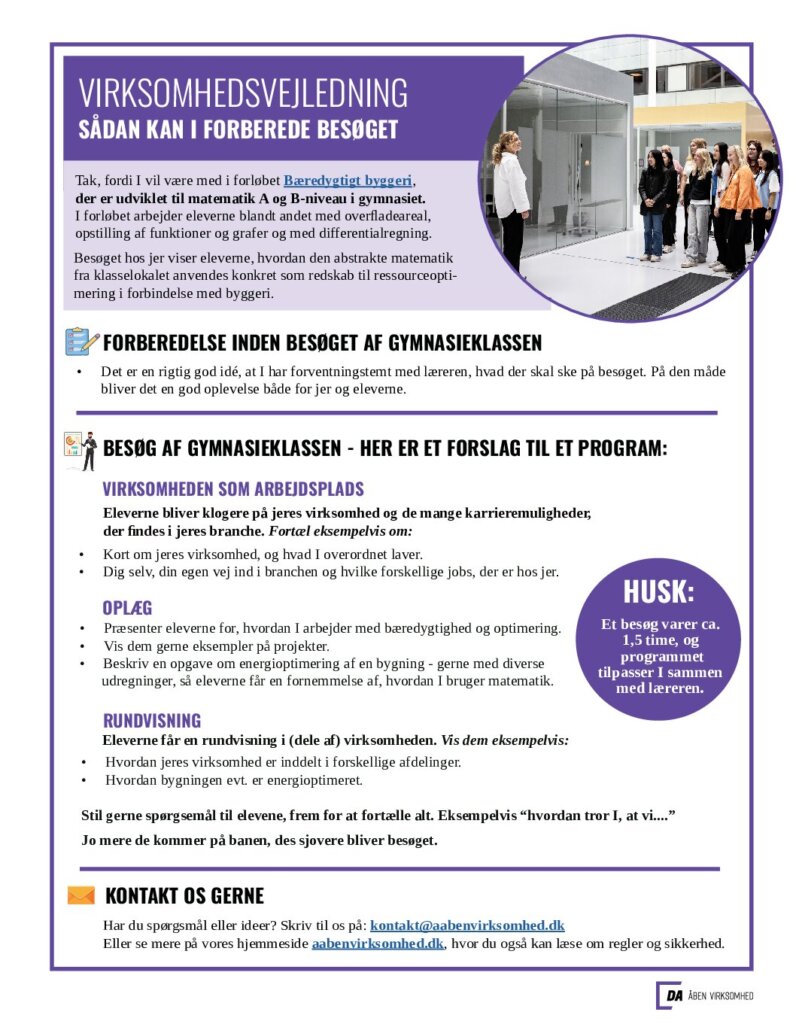 Hvis du er interesseret i et besøg hos Rambøll, kan du via knappen “Book dit besøg her” skrive til gymnasiekonsulent Charlotte Waltz hos Åben Virksomhed, og så hjælper hun dig med at sætte besøget i stand. Husk endelig at fortælle, hvad eleverne har arbejdet med forud for besøget. På den måde gør du det nemt for virksomheden at tale relevant ind i det, I har arbejdet med hjemme i klassen.