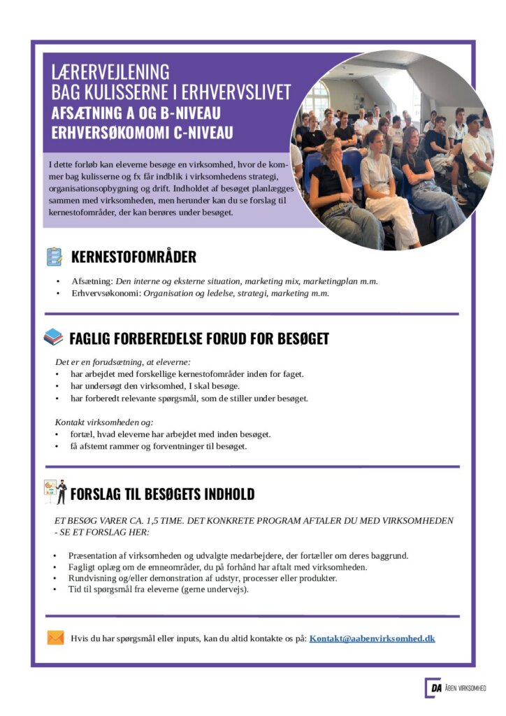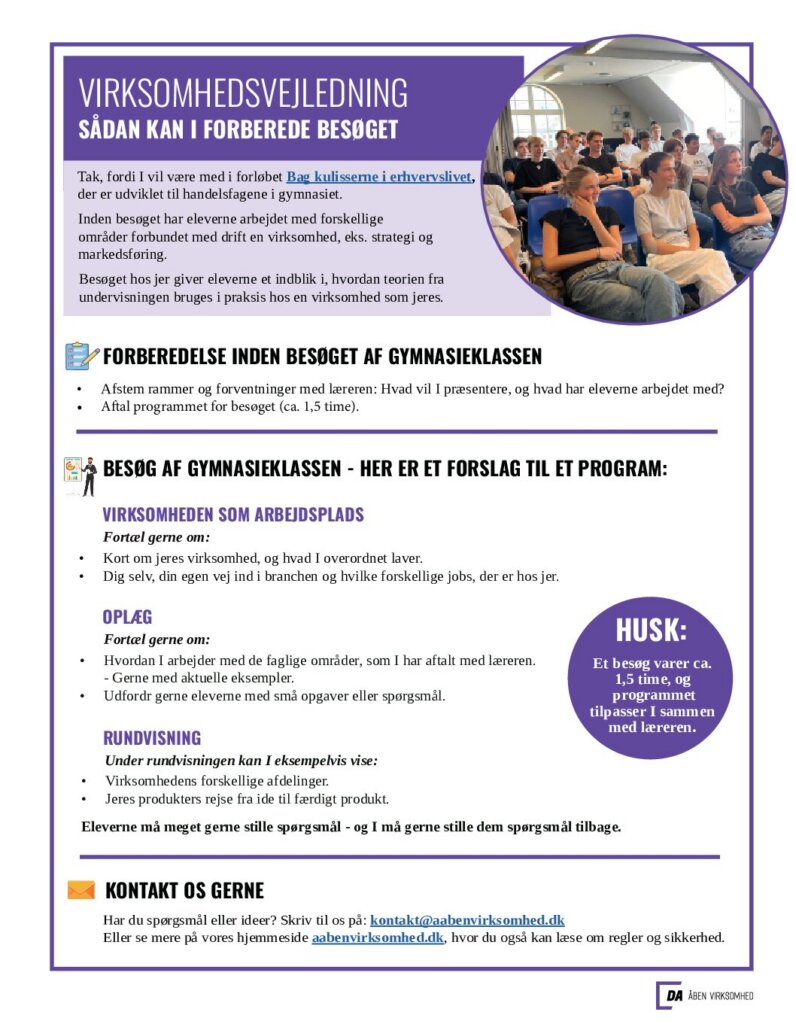 Hvis du er interesseret i et besøg hos VPK Packaging kan du via knappen “Book dit besøg her” skrive til gymnasiekonsulent Charlotte Waltz hos Åben Virksomhed, og så hjælper hun dig med at sætte besøget i stand. Husk endelig at fortælle, hvad eleverne har arbejdet med forud for besøget. På den måde gør du det nemt for virksomheden at tale relevant ind i det, I har arbejdet med hjemme i klassen.