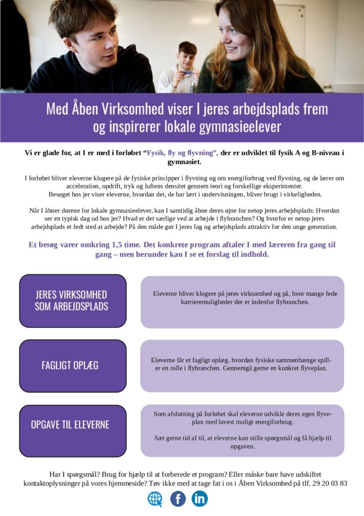 Hvis du er interesseret i et besøg hos Copenhagen Airtaxi i Roskilde, kan du via knappen “Book dit besøg her” skrive til gymnasiekonsulent Charlotte Waltz hos Åben Virksomhed, og så hjælper hun dig med at sætte besøget i stand. Husk endelig at fortælle, hvad eleverne har arbejdet med forud for besøget. På den måde gør du det nemt for virksomheden at tale relevant ind i det, I har arbejdet med hjemme i klassen.
