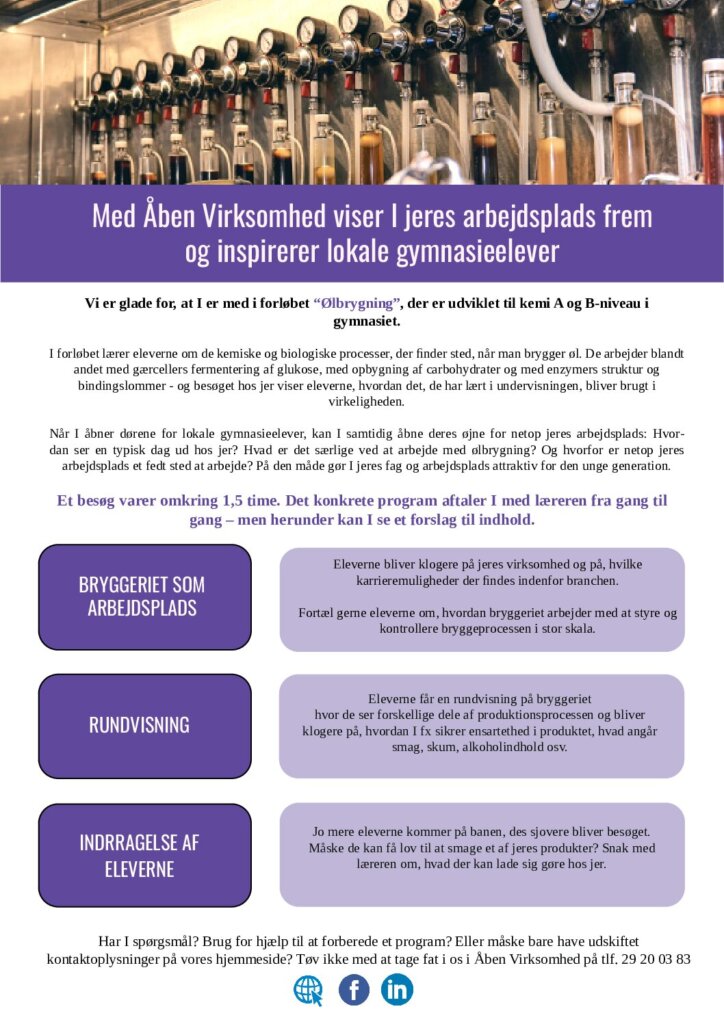 Hvis du er interesseret i et besøg hos Fur Bryghus, kan du via knappen “Book dit besøg her” skrive til gymnasiekonsulent Charlotte Waltz hos Åben Virksomhed, og så hjælper hun dig med at sætte besøget i stand. Husk endelig at fortælle, hvad eleverne har arbejdet med forud for besøget. På den måde gør du det nemt for virksomheden at tale relevant ind i det, I har arbejdet med hjemme i klassen.