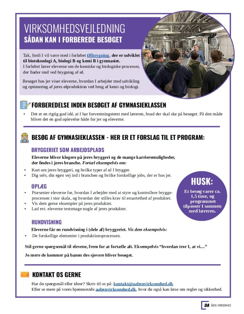 Hvis du er interesseret i et besøg hos Thisted Bryghus A/S, kan du via knappen “Book dit besøg her” skrive til gymnasiekonsulent Charlotte Waltz hos Åben Virksomhed, og så hjælper hun dig med at sætte besøget i stand. Husk endelig at fortælle, hvad eleverne har arbejdet med forud for besøget. På den måde gør du det nemt for virksomheden at tale relevant ind i det, I har arbejdet med hjemme i klassen.