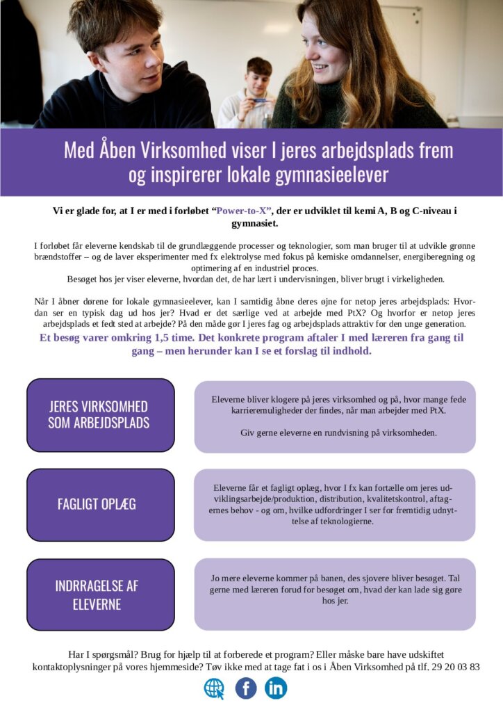 Hvis du er interesseret i at få besøg af A2X, kan du via knappen “Book dit besøg her” skrive til gymnasiekonsulent Charlotte Waltz hos Åben Virksomhed, og så hjælper hun dig med at sætte besøget i stand. Husk endelig at fortælle, hvad eleverne har arbejdet med forud for besøget. På den måde gør du det nemt for virksomheden at tale relevant ind i det, I har arbejdet med hjemme i klassen.
