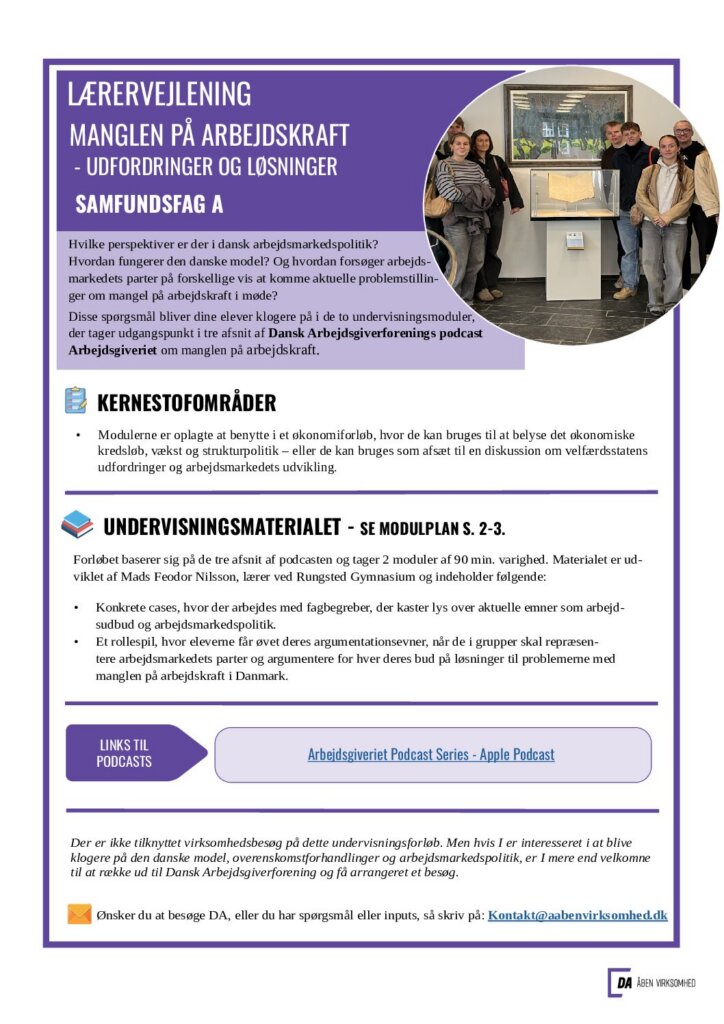 Forløbet består af to moduler og tager udgangspunkt i tre afsnit af Dansk Arbejdsgiverforenings podcast Arbejdsgiveriet om manglen på arbejdskraft.