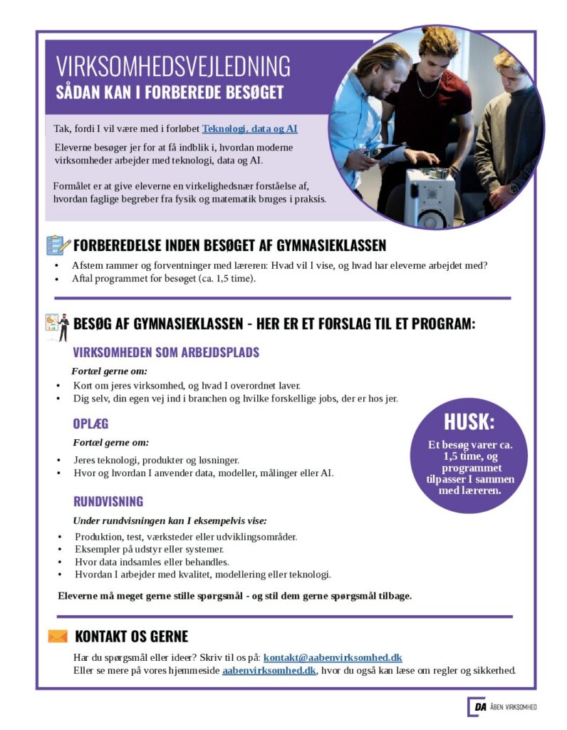 Besøg en virksomhed, der arbejder med moderne teknologier som dataanalyse, sensorer, digitalisering, automatisering og kunstig intelligens. – og som kan vise eleverne, hvordan de ting, de har arbejdet med i undervisningen bliver brugt i praksis.