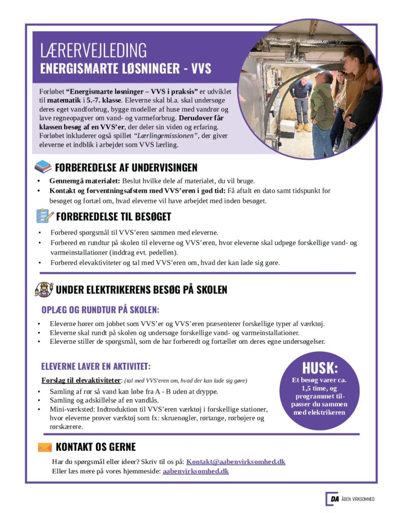 For at sikre det bedste udbytte af besøget, vil vi anbefale, at du fortæller VVS’eren, hvad eleverne allerede har arbejdet med i klassen. På den måde kan VVS’eren målrette besøget og skabe en relevant og inspirerende oplevelse for dine elever.