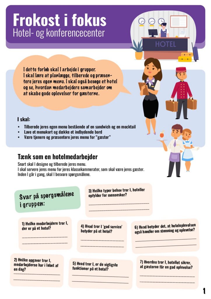 Husk endelig at fortælle hotellet, hvad eleverne har arbejdet med forud for besøget. På den måde gør du det nemt for hotellet at tale relevant ind i det, I har arbejdet med hjemme i klassen.