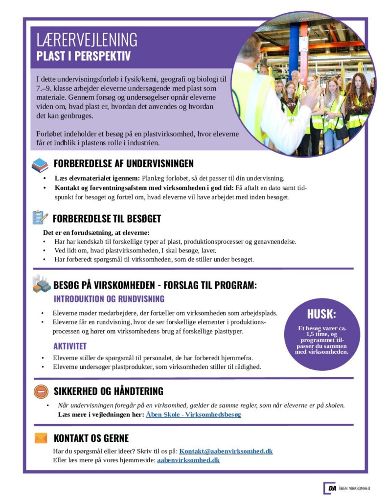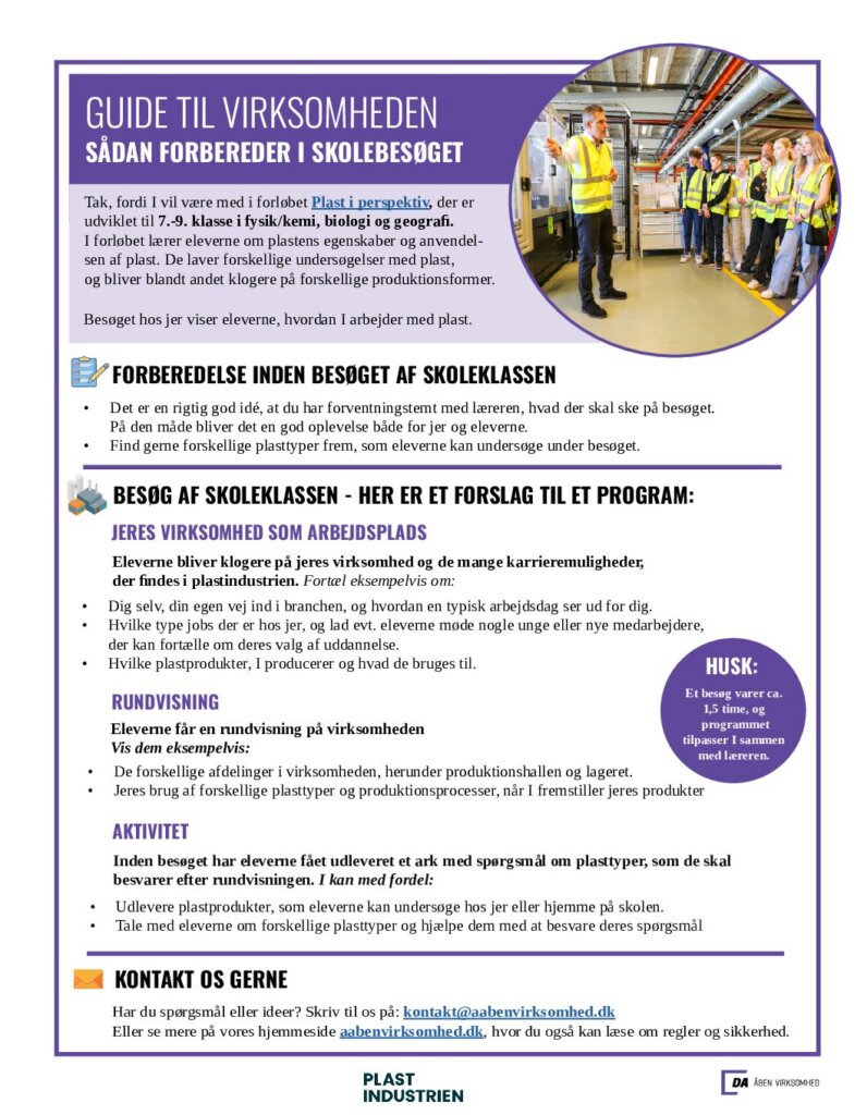 Du finder også undervisningsmateriale, som du kan bruge i det omfang, du har lyst – og en guide til, hvordan du griber virksomhedsbesøget an.
