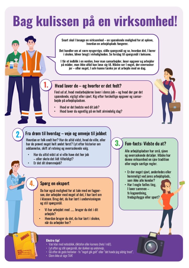 “Bag kulissen på en virksomhed” forbereder eleverne på et virksomhedsbesøg og kan med fordel kombineres med andre af vores undervisningsforløb.