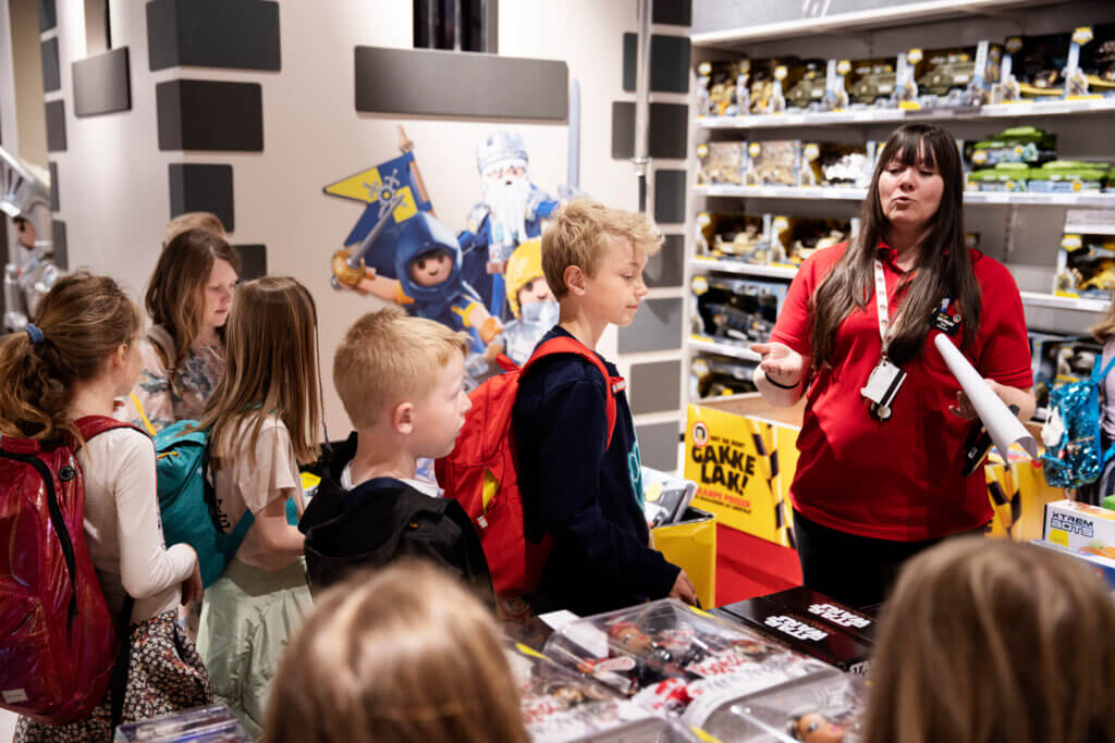 I en 2. klasse har en flok eleverne været i fuld gang med et tværfagligt forløb om tal og købmandsregning. Hjemme på skolen har de designet deres egen butik, øvet sig i små regnestykker og arbejdet med ord som tilbud, rabat og mersalg gennem lege og spil. Nu står klassen forventningsfuldt foran BR i Næstved, hvor de skal opleve, hvordan butikkens hverdag kobler sig til det, de har lært på skolen.